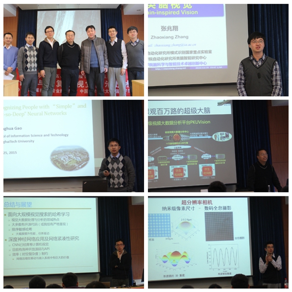 本次报告会邀请了北京大学、中科院自动化所、南京大学、厦门大学、上海科技大学等国内著名高校和研究机构的5位专家学者做主题报告。国家杰出青年科学基金获得者、北京大学计算机科学技术系主任、数字视频编解码技术国家工程实验室副主任黄铁军教授,中科院脑科学与智能技术卓越创新中心学术骨干、中科院自动化所研究员张兆翔博士,国家优秀青年科学基金获得者、厦门大学“闽江学者”特聘教授纪荣嵘博士,国家优秀青年科学基金获得者、南京大学副教授曹汛博士,上海市浦江人才计划入选者、上海科技大学研究员高盛华博士,分别作了《类脑计算机——从理念到实践》、《类脑视觉:现状、思考与尝试》、《光场和计算摄像学》、《视觉大数据的紧凑性问题研究:深度网络压缩与特征哈希》、《鲁棒的人脸表达在单训练样本人脸识别中的应用》的精彩报告。专家们结合前沿学术理论和最新研究成果多方面展现了类脑计算和计算机视觉领域的独特魅力。