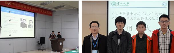 2015年度海峡两岸大学生科技文化交流活动于12月3日至6日在广州中山大学举行。我校组成了一支由魏志远、吉聆远、朱家纬三名本科生为代表的参赛队伍,由陶小平老师带队参加了海峡两岸物理类本科生学术演讲邀请赛及科技文化交流活动。