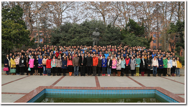 颁发仪式前,校领导和颁奖嘉宾与获奖学生在郭沫若广场前合影留念。