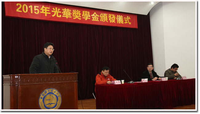 学生工作部处副部处长李峰在仪式上宣读了学校有关表彰文件及获奖同学名单。今年我校共有275名同学获得光华奖学金,其中本科生60名,研究生215名,获奖额度为每人1000元人民币。