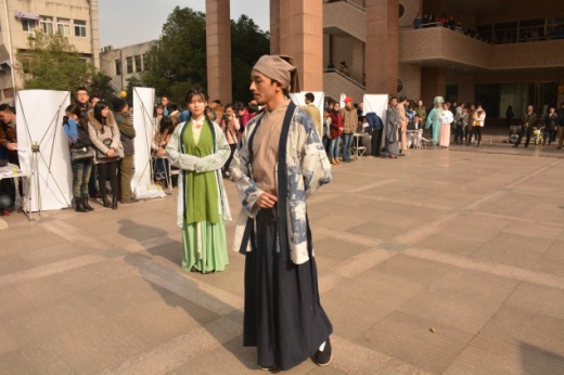 在八朝传统服饰走秀表演中,十六名“模特”身着各时代特色服装,仿照朝代习俗,在人群面前依朝代顺序展示了华服之美乃至华夏文化之美,引人赞叹。