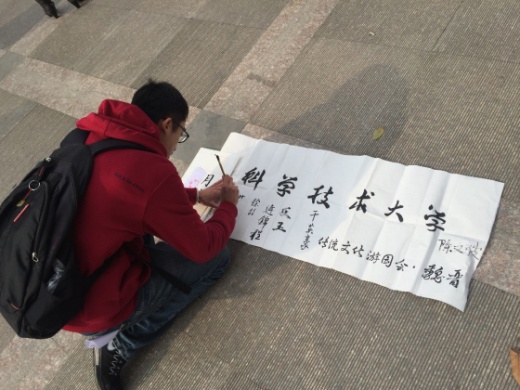 魏晋展台前,同学们各展身手,纷纷执笔,在宣纸上书写。“松下问童子”、“白日依山尽”,同学们有的写下耳熟能详的诗句,有的签下自己的名字。活动也吸引了我校外国友人,他们参与其中,体会了魏碑的风骨。