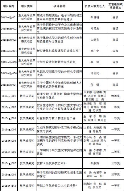 经省教育厅组织的专家网评和会评,我校“高成本物理实验:电子与物质相互作用系列虚拟仿真实验建设”等7项教育教学改革项目获批准为重大教学改革研究项目,“理实交融拓展创新构建大学物理互动教学体系”等11项教学成果荣获省级教学成果奖,其中有三项一等奖成果是依据《安徽省教育厅关于做好大学生创新创业训练计划实施工作 加强学科和技能竞赛项目管理的意见》(皖教秘高〔2014〕1号)评选出的竞赛类教学成果奖(详见附表)。