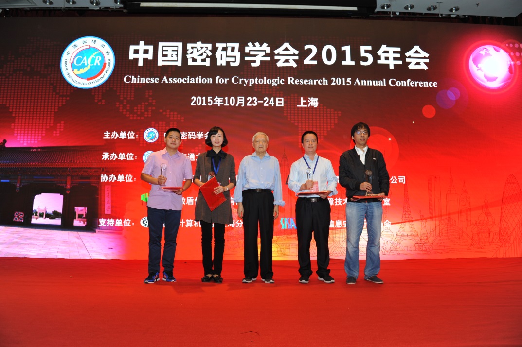 中国密码学会理事长裴定一教授为获奖者颁奖,右二为王双副教授