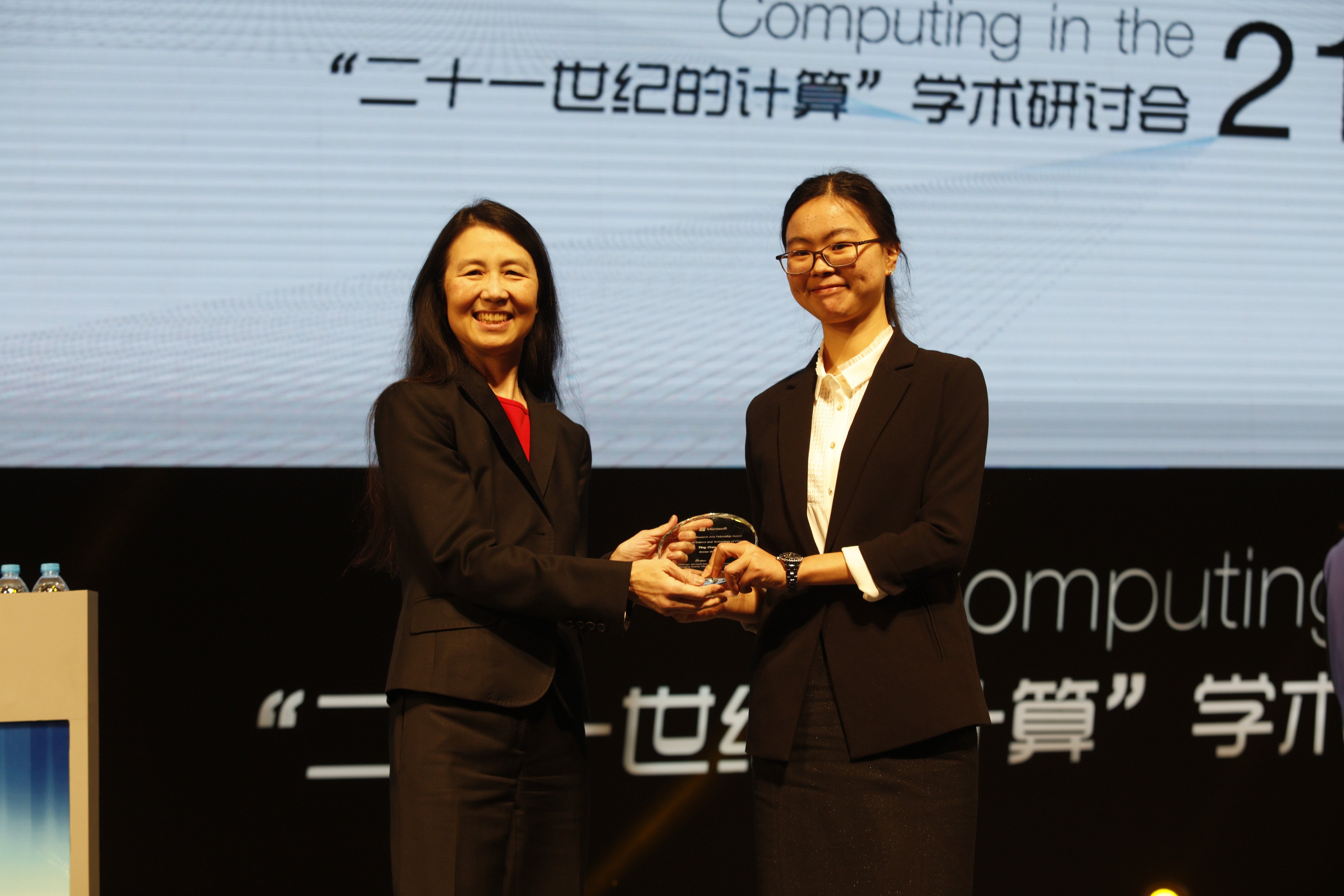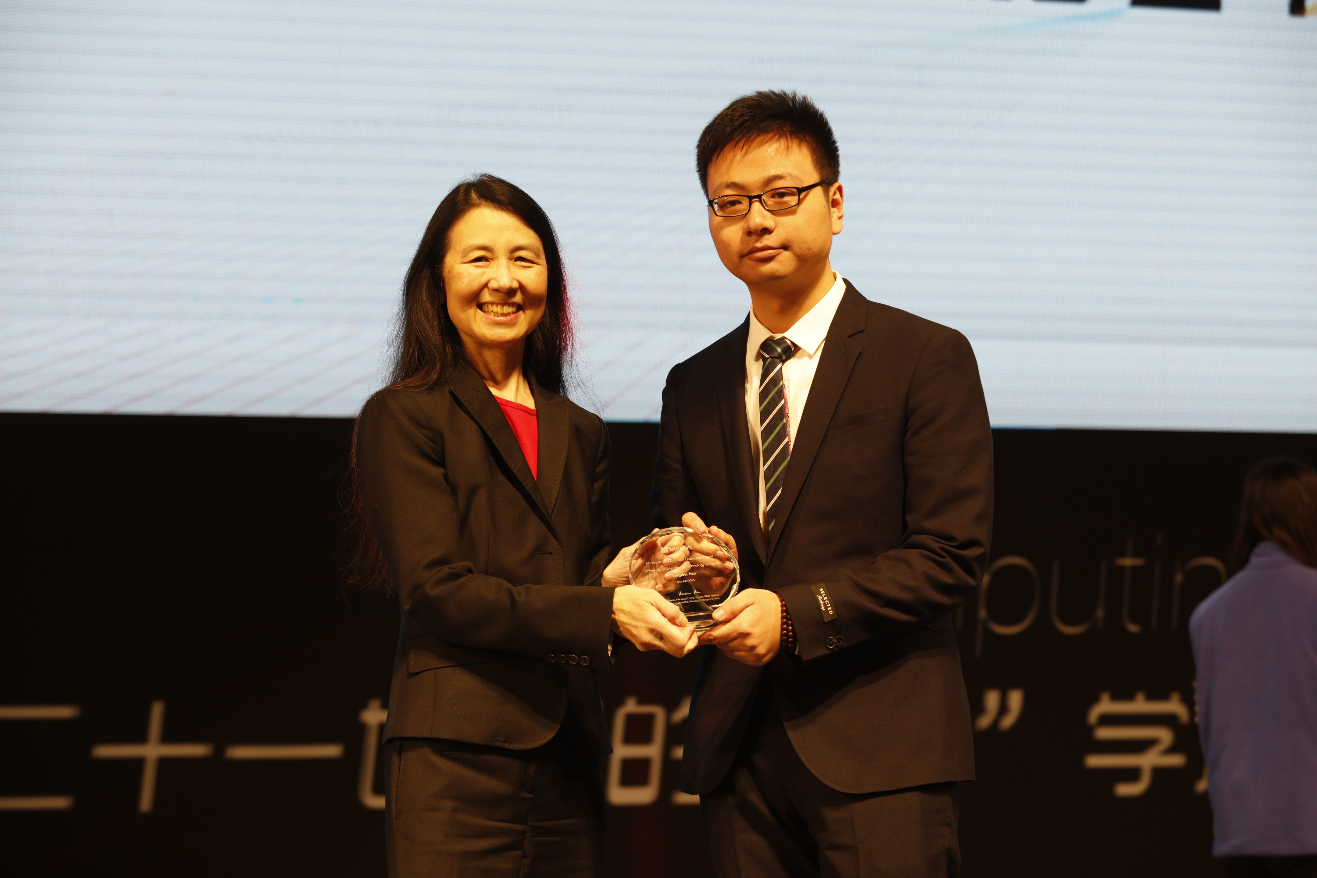 在刚刚结束的2015年度“微软学者”奖学金评审中,我校博士生潘滢炜、张婷同学荣获该项殊荣,并在刚刚结束的“21世纪的计算”大会上与其他11位获奖者一起,接受了微软全球资深副总裁周以真博士以及微软全球资深副总裁、微软亚洲研究院院长、微软亚太研发集团主席洪小文博士的颁奖。