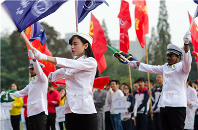 化学与材料科学学院的同学们迈着正步、排成苯环的造型,国家同步辐射实验室、核科学技术学院联队方阵演绎了核裂变与核聚变的过程,火灾科学国家重点实验室方阵以卡通人物形象出场、用奥运五环的造型展现了体育精神......精彩纷呈的入场式,赢得了全场观众的阵阵喝彩。