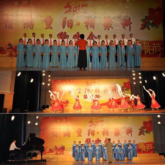 安徽大学老年大学海燕舞蹈队为大家带了热情洋溢的舞蹈《西班牙女郎》,歌唱班带来了合唱《红月亮》、《月亮颂》。值得一提的是,他们合唱队员们平均年龄已达77岁。夕阳红模特队的队员们伴着《烟花三月》的婉转曲调带来了优雅的时装表演《似水年华》,将时尚与美演绎得惟妙惟肖。合肥工业大学金晚霞合唱团带来了合唱曲目《共筑中国梦》、《故乡之恋》,合肥工业大学红叶舞蹈队和老年大学舞蹈班带来了民族舞表演《最美还是我们新疆》。