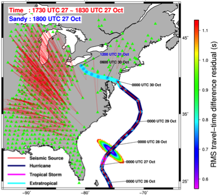 为此,温联星研究组研究建立了一个大气、海洋和固体地球相互耦合的物理模型,利用地震信号成功追踪2012年桑迪飓风中心位置,并监测飓风中心的海面气压扰动与海浪高度。研究还发现了传统卫星监测方法所无法观测到的、飓风消失以后的潜在灾害。研究显示美国新英格兰附件海域在桑迪飓风消失后仍然存在地震源,表明这些地区依然存在被海浪袭击的风险。