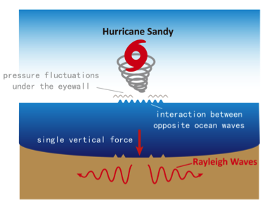 “但是,飓风会促使大气、海洋和固体地球相互耦合。”温联星教授介绍说,飓风通过风眼墙底部的气压扰动激发海浪,海浪的非线性相互作用在海底产生压强扰动,如同击鼓一般将能量传递给固体地球,产生微弱的地震波。因此,通过测量由飓风触发的微弱地震波,可以实现对飓风的实时、有效的监测。