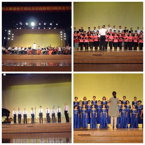 9月12日下午,校东区大礼堂里,我校离退休干部欢聚一堂,金秋艺术团以文艺汇演的方式隆重纪念中国人民抗日战争暨世界反法西斯战争胜利七十周年。