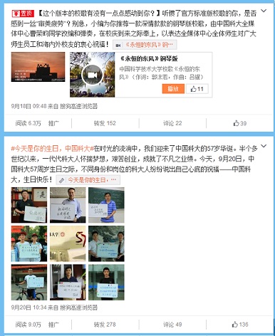 中国科大官方微信、官方微博于9月18日和9月20日分别推出校庆系列宣传主题,引发广大师生校友、社会各界人士的广泛关注,取得了良好的传播效果。9月20日当天推出“今天是你的生日,中国科大!”主题,截止至9月21日中午,在官方微信上浏览量达49300余次,并赢得大量评论、点赞;在官方微博上浏览量达90000余次,转发、评论330多次。9月18日推出“钢琴版中国科大校歌”主题,在官方微信上浏览量达9000余次,在官方微博上浏览量达63000余次。