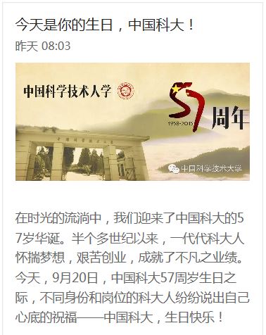 9月20日是中国科学技术大学57周年校庆日。自9月18日起,中国科大在校师生、海内外校友和社会各界人士,纷纷通过学校官方微信(ustcnews)、官方微博(http://weibo.com/ustc)向中国科大57周年校庆送上祝福。