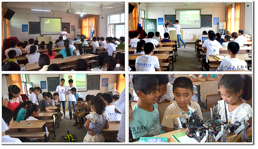 数学科学学院实践服务团在淮南市孔店乡孔店中学与学生互动,寓教于乐,大家不亦乐乎。信息学院实践服务团在安徽省枞阳县横埠中学把先进的电子科技知识、电子技术前沿的相关信息通过生动的讲课传授给学生。