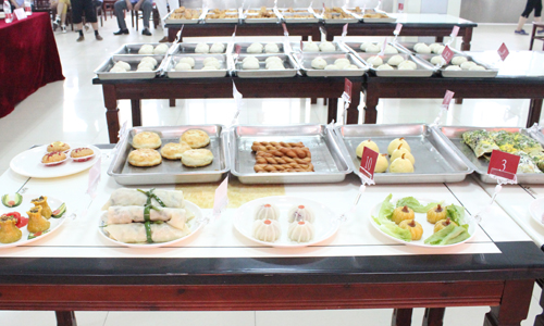 8月10日下午进行了大锅菜比赛,来自全校食堂15名厨师分成三组,分别进行了清炒土豆丝、红烧豆腐与自选菜的制作。此次比赛规则充分参考了安徽省高校学生食堂烹饪比赛要求,强调了高校食堂为学生服务的本质与特色。按照比赛要求,每道菜肴熟重量不低于2500克,整盘菜肴不加装饰送评,自选菜品种也特别强调了需适应学生食堂的要求,能在高校大伙食堂推广。8月11日下午是大众面点比赛,12名参赛选手分成两组参赛,分别制作了提花包、油条和自选面点,其中自选面点需适应学生食堂要求,能批量生产,具有较强的推广性。
