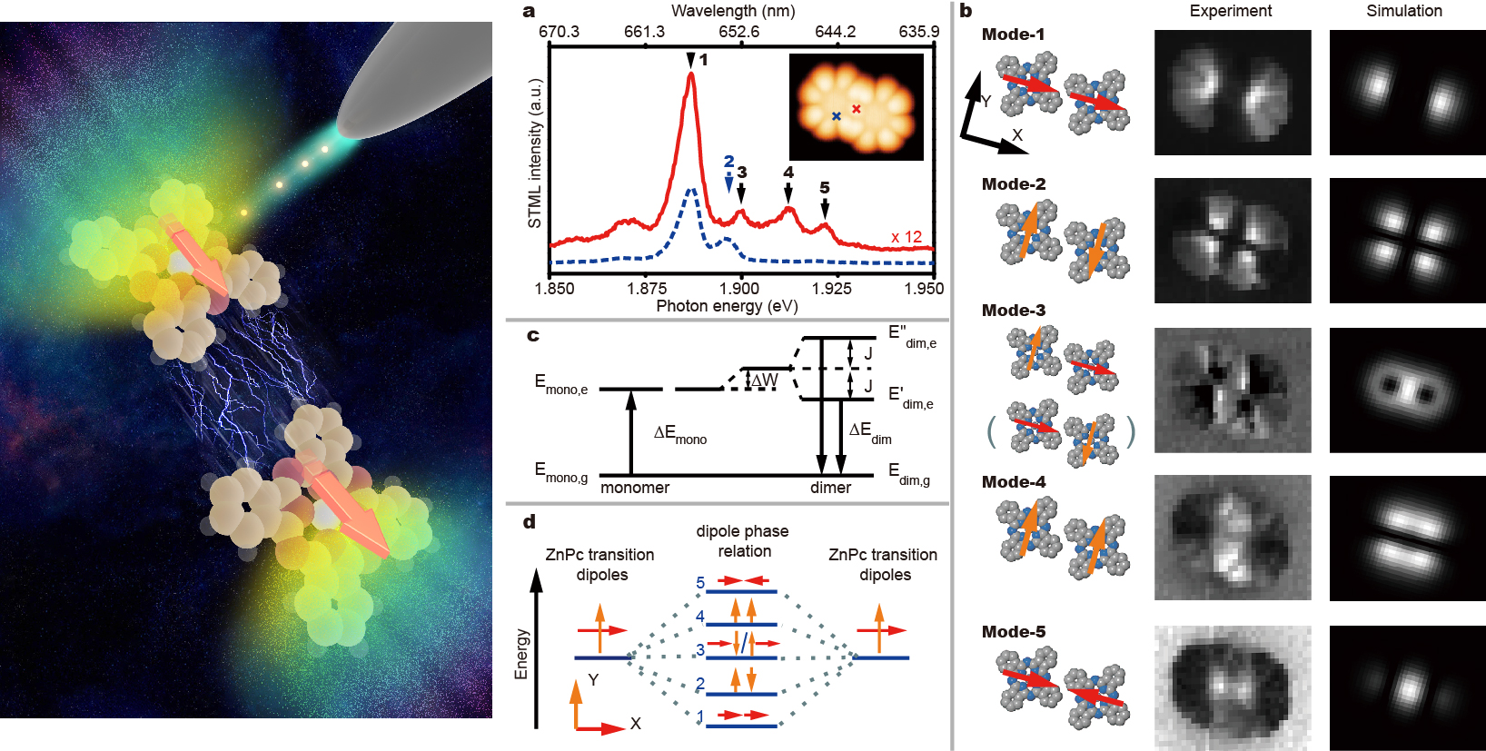 图注:左图为实验的艺术渲染图。右图为利用亚纳米分辨的光谱成像技术,对锌酞菁染料分子二聚体的各种偶极耦合方式的实空间成像表征。(艺术图由王国燕、孙大平提供。)