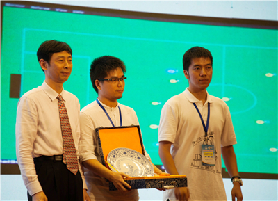 在仿真2D组的比赛中,中国科大蓝鹰机器人足球队以4:0战胜日本Helios队,获得第19届RoboCup机器人世界杯足球赛仿真2D组冠军。这也是蓝鹰机器人足球队连续第三年夺得该项目的世界冠军。 比赛哨声吹响,蓝鹰队就抓住对方漏洞来了一次迅猛的快攻,上半场开场不到一分钟就成功破门,占取领先地位。接着,对手发出了一波波猛烈反攻,蓝鹰队一一顶住。抓住一个空当,反客为主进行反击,成功再下一城。上半场以2:0领先。在下半场中,蓝鹰队继续扩大优势,再入两球,最终将比分定格在4:0,在决赛局成功反超对手,将冠军收入囊中。