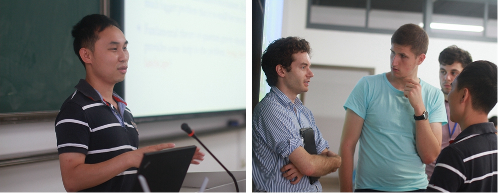 6月29日开营仪式后,每天上午都有国内外物理教授们精心准备的学术报告,涉及量子信息,弦理论,核聚变等物理前沿问题。营员们无论是报告中还是报告后都积极提问,反响热烈。营员中不乏“谢耳朵”这样的热爱理论物理的人,理论物理学科黄民信教授做完“String Theory and Its Applications”报告后被热情的营员们围住提问,在下一场报告开始才不舍的散去。