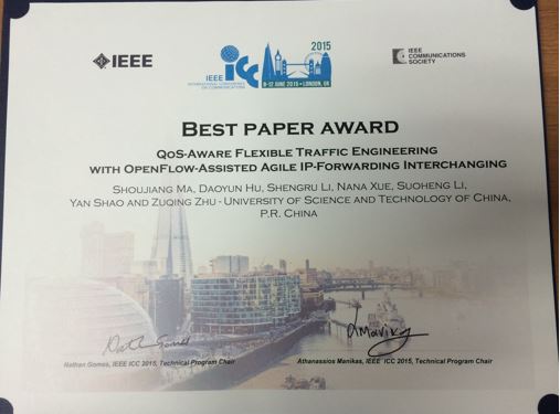 日前,在英国首都伦敦召开的IEEE International Conference on Communications(IEEE ICC 2015)会议上,我校中国科学院电磁空间信息重点实验室朱祖勍副教授团队的研究论文“QoS-Aware Flexible Traffic Engineering with OpenFlow-Assisted Agile IP-Forwarding Interchanging(利用OpenFlow辅助的IP转发灵巧切换实现服务质量感知的灵活流量工程)”获得了大会颁发的最佳论文奖(Best Paper Award)。