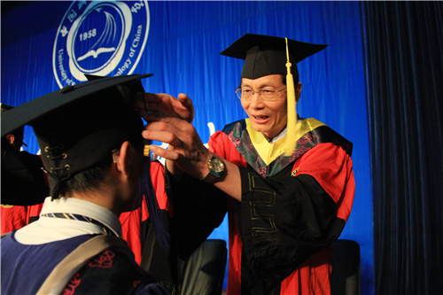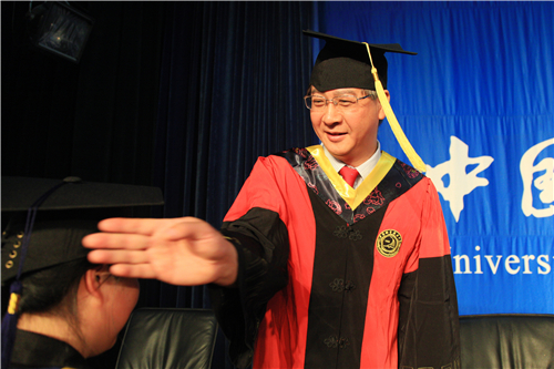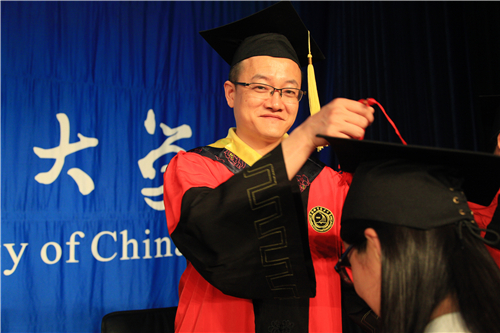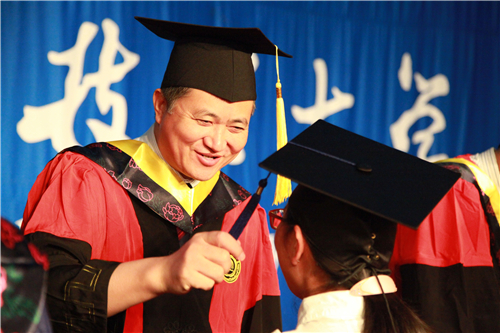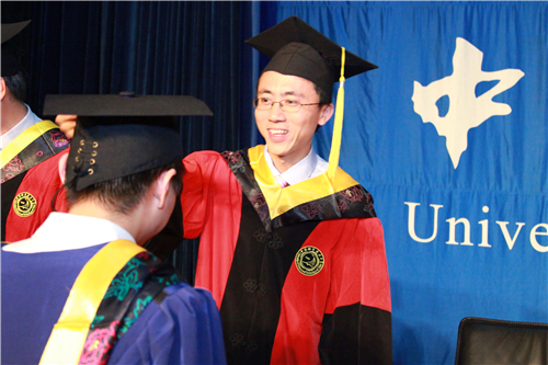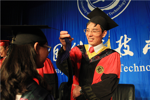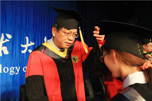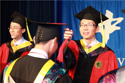 最后,伴随着熟悉的校歌旋律,同学们身着学位服依次走上主席台,校领导和导师代表们为他们一一扶正流苏。