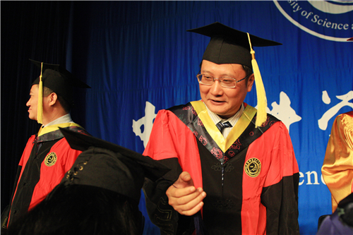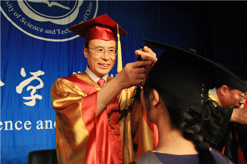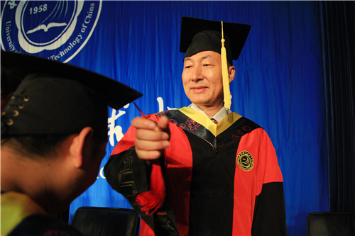 下午三点,毕业典礼正式开始。在同学们的欢呼声中,校领导许武、万立骏、陈初升、蒋一,导师代表陈旸、李嘉禹、杜江峰、杨金龙、陈华平、汪毓明、宋伟、陆亚林、张和平身着导师服在主席台就坐。毕业典礼由张淑林副校长主持。
