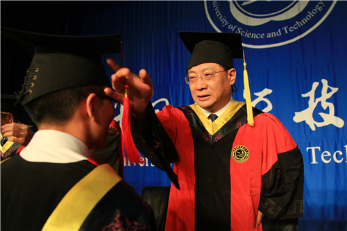 校学位委员会主任、校长万立骏院士向全体毕业生送上了临别的祝福和希望。他首先代表全校师生员工向获得学位的各位同学表示祝贺,向毕业生的家长、老师和朋友表示感谢。他说,从跨入科大校门、选择读研深造的那一天起,同学们就选择了一条不甘平庸、追求卓越的人生道路。近几年学校的科研创新能力不断提升,其中发表的高质量学术论文、学术论文的篇均引用率、自然出版指数等指标均位居全国高校前列。今天的科大建设,有在座各位同学的青春和汗水,同学们为中国科大建设世界一流大学作出了重要贡献。