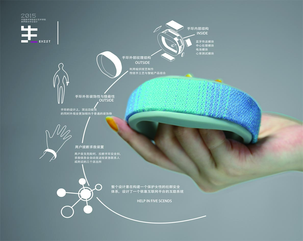 循着共同的兴趣,两校部分同学开始组成联合项目组,开展创新实践。其中一个小组的攻关课题是解决女性安全问题,在2014年秋季学期中,中科大同学已开展了较多的用户需求分析和市场现状调研,并对产品功能做了初步的策划。随着美院同学的加入,两校同学发挥各自特长,无论产品功能还是用户体验都进行了细致的打磨,并且在人机交互等细节上做出了令人惊喜的创新。两校同学协同创新的智慧成果——“腕无一失”女性安全智能手环,先后在中国美院2015年毕业设计展和中国科大“设计思维与创新实践”研讨会上展出,得到了中国美院许江院长、中国美院设计学院吴海燕院长,中国科大李卫平教授、李斌教授、陈志波教授,以及来自Intel、IBM、百度、讯飞、中国文化产业投资基金等著名企业的专家的一致赞赏。