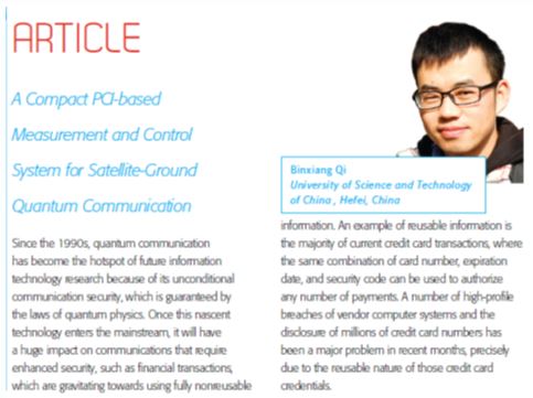 近日,美国电子与电气工程师学会(IEEE)《NPSS News》2015年春季版以Article的形式专文介绍了我校核探测与核电子学国家重点实验室博士生祁宾祥(导师:近代物理系刘树彬教授)等人的获奖论文工作,文章标题为《A Compact PCI-based Measurement and Control System for Satellite-Ground Quantum Communication》。这是核探测与核电子学国家重点实验室的学术论文在IEEE通讯快报上首次被专文介绍。