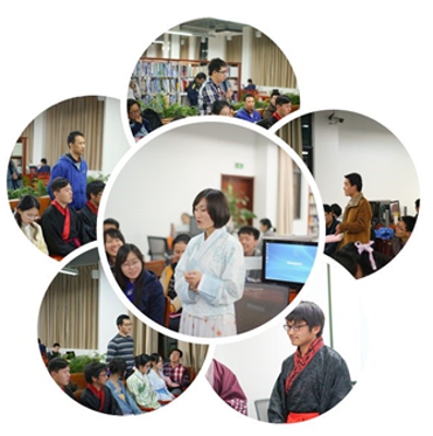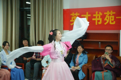 伴着一曲惊鸿翩翩起舞,英才书苑迎来了第二届文化沙龙活动——汉文化沙龙。参加此次活动的有图书馆直属党支部书记兼副馆长汪忠诚,图书馆有关老师,以及来自校芳草社、舞蹈团、惊蛰文学社学生代表和观止茶舍的校友。