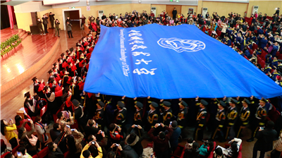 典礼第一项议程是“出校旗”。校旗护卫队的同学高高擎起一面巨幅校旗,从后排缓缓移向主席台,最后将校旗悬挂在主席台中央。校旗从同学们的头顶掠过时,礼堂中响起阵阵掌声和欢呼声。