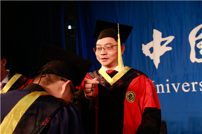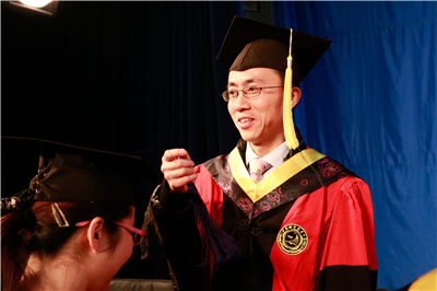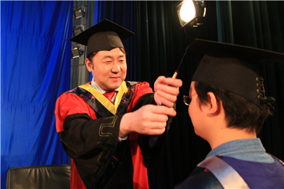 最后,在豪迈的校歌旋律中,同学们身着学位服依次登上主席台,校领导和导师们为他们一一扶正流苏,合影留念。