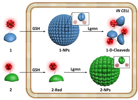 Lgmn是一种属于半胱氨酸蛋白酶C13家族的天冬酰胺内肽酶。它和炎症性疾病如动脉粥样硬化、中风和癌症等密切相关。并且Lgmn过表达在大多数肿瘤中,包括乳腺肿瘤、结肠肿瘤、前列腺肿瘤以及中枢神经系统肿瘤中。尽管Lgmn与很多恶性肿瘤关联紧密,但基质衍生Lgmn的确切作用仍然得不到完整的定义。这就需要更加灵敏的和生物兼容的方法来检测体外和体内的Lgmn活性。19F在体内极低的背景信号使得19F MRI具有很高的灵敏度和特异性,而核磁成像技术的强穿透性及无损等优点也使得19F MRI的研究得到越来越多的关注。但是19F MRI通常需要高剂量的探针来提供足够的信号,这就带来了剂量毒性的风险,并且需要耗费大量的化合物。因此发展出“智能”策略来降低探针剂量实现Lgmn靶向是十分必要的。