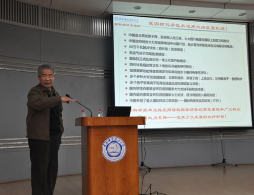 万元熙院士在报告中介绍了当前国际社会核科学技术领域的研究现状及目前我国核技术领域的最新发展形势,指出核科学领域不但是属于战略高技术领域,也是国家核心利益和实力的具体标志之一,而且在国民经济中起到独特作用和具有重要地位。他从核物理前沿研究、先进裂变堆研究、未来聚变能开发、以及核燃料、核材料、核化学、核辐射防护、核医学等各个方面全面铺开,向同学们完整地展示了这些科研领域的广阔研究前景。在核聚变能方面,他概要介绍了中国磁约束聚变能发展技术路线图的编制情况,中国聚变工程实验堆(CFETR)的设计工作进展,先进聚变能和等离子体科学协同创新中心培育情况以及中国科学院磁约束聚变理论研究中心的组建情况。