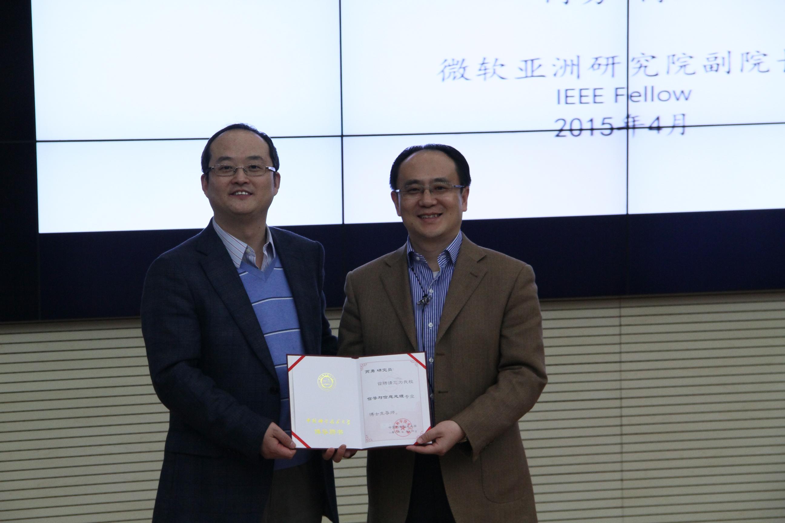 报告会前,吴枫教授向芮勇博士颁发了中国科大兼职博导证书。芮勇博士表示期待为学校培养出在信息领域的领军人才。