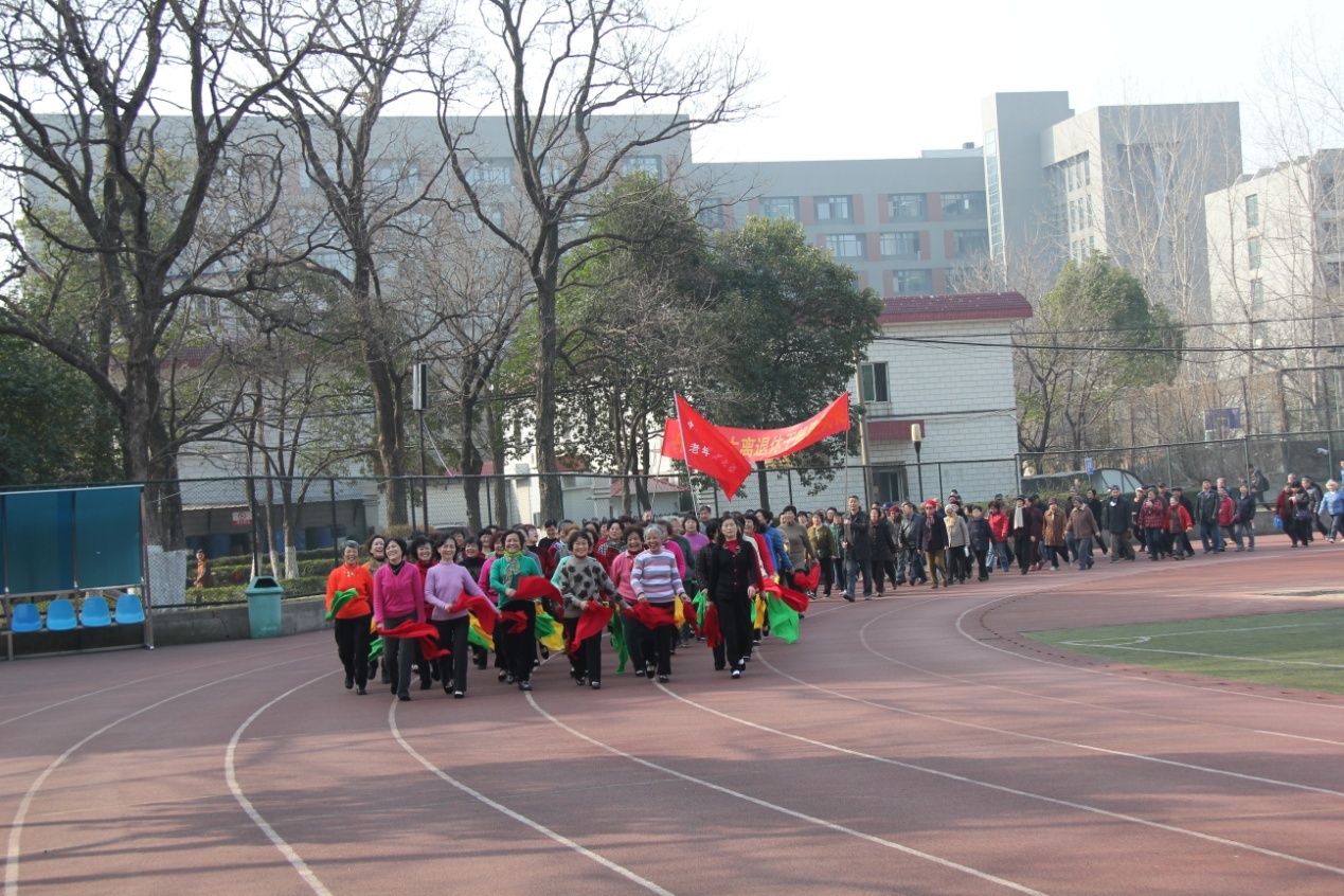 整装待发,气势恢宏。随着发令枪响,运动员进行曲奏起,健身走队伍在老年体育协会会旗和“中国科大离退休干部迎新春、庆三八健身走”的横幅引领下,由秧歌队带头,沿着操场缓步行进。近700人的队伍宛若一条长龙,甚为壮观。