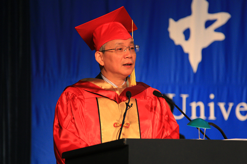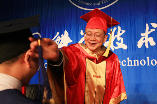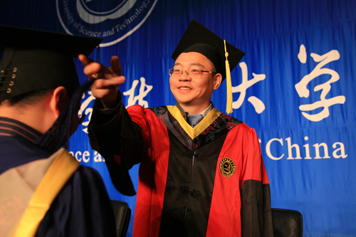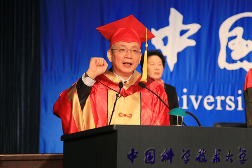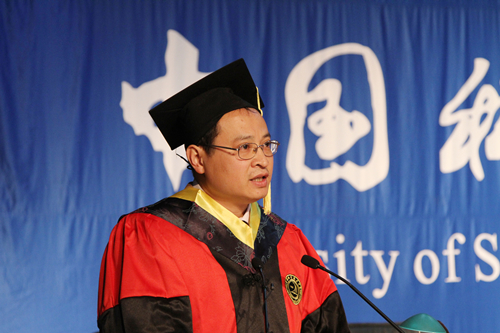 侯建国校长以学长和朋友的身份与毕业生进行了一场真诚的谈话。侯校长首先谈到,我校“中科院人才计划”陈秀雄教授、孙崧博士和英国数学家唐纳森合作,于今年5月成功破解了第一陈类为正时的 “丘成桐猜想”,给出了卡勒—爱因斯坦度量存在性之“丘成桐猜想”的完整证明。这一研究成果在国际上引起了强烈反响,标志着卡勒几何的研究达到一个全新的高度。陈秀雄是著名几何学家卡拉比教授培养的最后一位博士,而孙崧又是陈秀雄教授的博士研究生,三代师生、两代科大人,半个世纪的科研接力,充分体现了 “脚踏实地、持之以恒”。他希望大家在未来工作中,继承和弘扬科大人追求卓越的信念和永不服输的精神,坚持脚踏实地、一步一个脚印,努力成就一番事业。