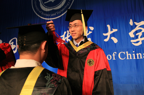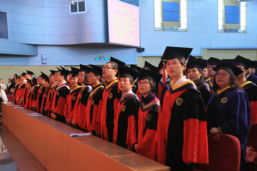 校领导许武、侯建国、蒋一,部分学院、国家重点实验室领导陈旸、汪毓明、陈华平、余玉刚、张和平以及导师代表曾建雄身着导师服在主席台就座。毕业典礼由张淑林副校长主持。
