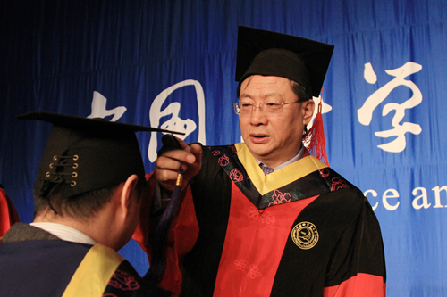 在侯建国校长的带领下,全体毕业生庄严宣誓:“感恩父母养育,感谢导师教诲,不忘母校培养。我们坚守母校信念,热爱科学、崇尚真理;我们传承母校精神,科教报国、追求卓越。我们用激情和智慧建设祖国,用责任和行动回馈社会,用成就和硕果回报母校!”