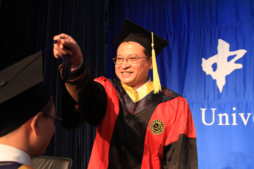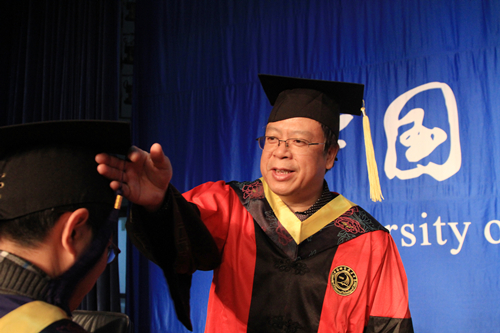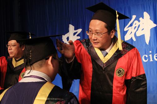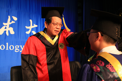 最后,在豪迈的校歌旋律中,同学们身着学位服依次登上主席台,校领导和导师们为他们一一扶正流苏,合影留念。