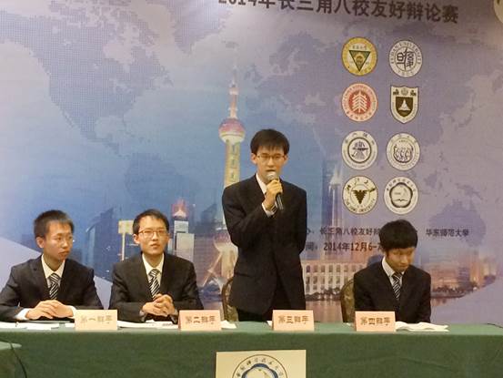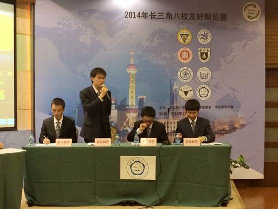 2014年第十届长三角八校友好辩论赛在华东师范大学中举行,来自长三角地区八所“985工程”高校的辩论高手齐聚上海,展开激烈的唇枪舌战。我校在初赛迎战浙江大学,双方围绕 “青年处事,审时度势还是坚持原则更可贵”展开辩论,我校辩论队以扎实的立论、深刻的价值和协调的团队配合赢得胜利,顺利晋级。来自地球与空间科学学院的程治勋同学以优异的表现获得最佳辩手的称号。复赛中遭遇东道主华东师范大学,双方就“当今青年,中国心灵是否应重于全球眼光”进行交锋,我校从全球化时代中国在走向世界中迎接的种种挑战出发,以严整的逻辑,充实的数据支持,力克强敌,捧得金奖。