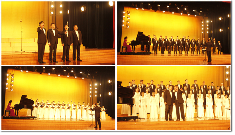 演出在悠扬的钢琴伴奏曲中拉开帷幕,身着黑色西服和白色连衣裙的歌唱家们走上台前,在指挥家张峥的指挥下,他们首先为大家带来了气势磅礴的混声合唱《救国军歌》和《延安颂》。歌唱家们演绎了男声合唱《共青团员之歌》、《草原骑兵哥》以及男声四重唱《游击队歌》、《啊朋友再见》和宛转悠扬的女声合唱《小路》、《延水谣》,广大师生在愉快舒适的氛围中领略了艺术之美,感受到心灵的震撼。