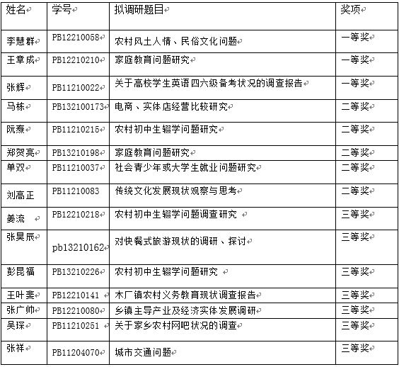 本次比赛先后历时四个月,同学们在暑假期间进行各种社会调研活动,对农村产业结构,土地利用率,城市交通,乡镇企业发展,民俗文化,家庭教育等社会问题进行了调研,在开学后提交相应稿件。比赛受到信息学院同学的广泛关注,大家积极参与和投稿,开学后组委会共收到有效稿件42份,经过两轮筛选与评比,最终评出包括“城市或农村信息化问题调研”、“风土人情、民俗文化问题”、“电商、实体店经营比较研究”、“农村初中生辍学问题研究”、“社会青少年或大学生就业问题研究”等在内的一、二、三等奖优秀调研作品共14篇。