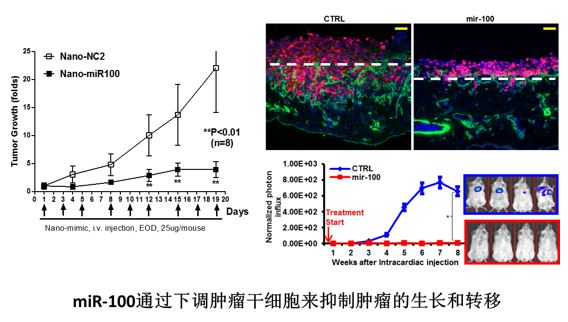 在此项研究中,研究人员证实miR-100参与了乳腺癌干细胞的自我更新。他们发现,miR-100的表达水平与细胞的分化状态相关,在乳腺肿瘤干细胞中miR-100表达水平很低。利用四环素诱导型慢病毒在乳腺肿瘤细胞中提高miR-100表达,发现miR-100过表达减少了乳腺癌干细胞的生成。进一步的机制研究表明,miR-100是通过下调乳腺肿瘤干细胞的一些调控基因包括SMARCA5、SMARCD1和BMPR2等的表达,在体外及小鼠移植瘤中抑制了癌细胞增殖。此外,他们还证实在原位移植或心脏注射中,立刻诱导miR-100可以阻止肿瘤生长和转移; 并且发现通过纳米载体可以将miR-100输送到肿瘤干细胞里,从而抑制了肿瘤的生长。在临床上,他们观察到乳腺癌样本中miR-100表达与患者存活率显著相关。