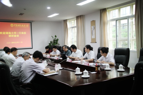 9月11日,湖南大学党委副书记唐亚阳率团来我校访问考察,就大学治理能力、校院两级管理体制机制、基层党组织建设及学术文化建设等内容进行调研交流。我校党委副书记蒋一会见了湖南大学代表团一行,数学科学学院、管理学院及党委宣传部、党政办公室、党委组织部等单位负责人及相关同志参加了座谈。