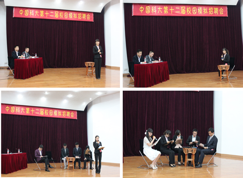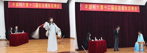 本届模拟招聘会的招聘团由安徽正德集团和安徽合叉叉车有限公司组成,竞聘职位是移动互联项目总经理助理和合叉叉车公司办公室主任。8名模拟竞聘者分别是来自我校不同专业的本科生和研究生。