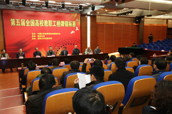 2月8日至12日,第五届全国高校教职工桥牌锦标赛在福州大学举行。首次参赛的我校教工桥牌代表队奋力拼搏,勇夺团体冠军。本次比赛由中国大学生体育协会桥牌分会主办,福州大学工会承办。教育部学生体育协会联合秘书处副秘书长、中国大学生体育协会专职副主席张燕军,福建省教育工委副书记、教育厅副厅长刘剑津等出席开幕式。