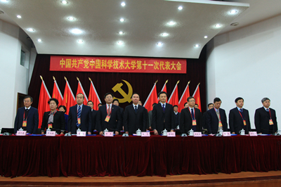 在朴素、整洁的水上报告厅内,气氛格外庄严热烈。大会主席台正上方悬挂着“中国共产党中国科学技术大学第十一次代表大会”的会标,背景帷幕正中悬挂着由鲜艳的十面红旗簇拥着的中国共产党党徽。