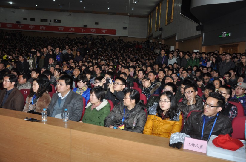 12月22日下午,著名学者易中天应邀在中国科学技术大学东区大礼堂作题为《历史的底牌》主题演讲,为了一睹易中天的风采,本能容纳1800人的大礼堂挤进3000多人,很多社会人士和其他高校的学生也慕名而来。本次活动由我校图书馆英才论坛主办,图书馆馆长助理宁劲主持。