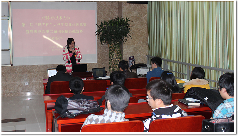 中国科学技术大学第二届“讯飞杯”大学生创业计划竞赛暨管理学院第二届创业精英挑战赛由校团委、管理学院联合举办,于2013年9月正式启动,得到了全校包括本科生、硕士研究生、博士研究生、MBA学员在内众多同学的关注,先后吸引了近400名同学报名参赛,共计正式组建47支参赛队。经过组队、培训、预赛环节,历尽3个月,产生了进入决赛的12支团队,并将在随后的三个月内开展集中培训、市场调研、模拟答辩等决赛准备,将于2014年3月进行决赛。