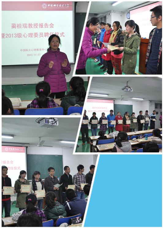 11月27日下午,2013级新生心理委员岗位聘任仪式暨心理学专题培训在东区2105教室举行。首都师范大学心理学教授蔺桂瑞、心理教育中心老师、2013级新生心理委员、第六届心理委员联合会理事以及学生助理一百余人参加了会议。学生处副处长、心理教育中心主任孔燕教授主持会议。