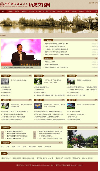 新开通的历史文化网站以学校的历史文化为主线,设有文化新闻、发展历程、媒体关注、科大叙事、科大精神、吾爱吾师、校友撷英、精彩社团、影像资料、校园风物、视觉识别等栏目。网站内容既有对学校办学历程和辉煌成就的全面回顾,也有对科教报国、锐意创新的优良传统的总结提炼;既有对名师大爱的精彩讲述,也有对多彩社团的生活观察;既有公共媒体对中国科大的解读,也有科大人的自我省思......多视角、多方位地展示了中国科大不折不挠、创新跨越的辉煌历程和学术优先、创新报国的文化精神。